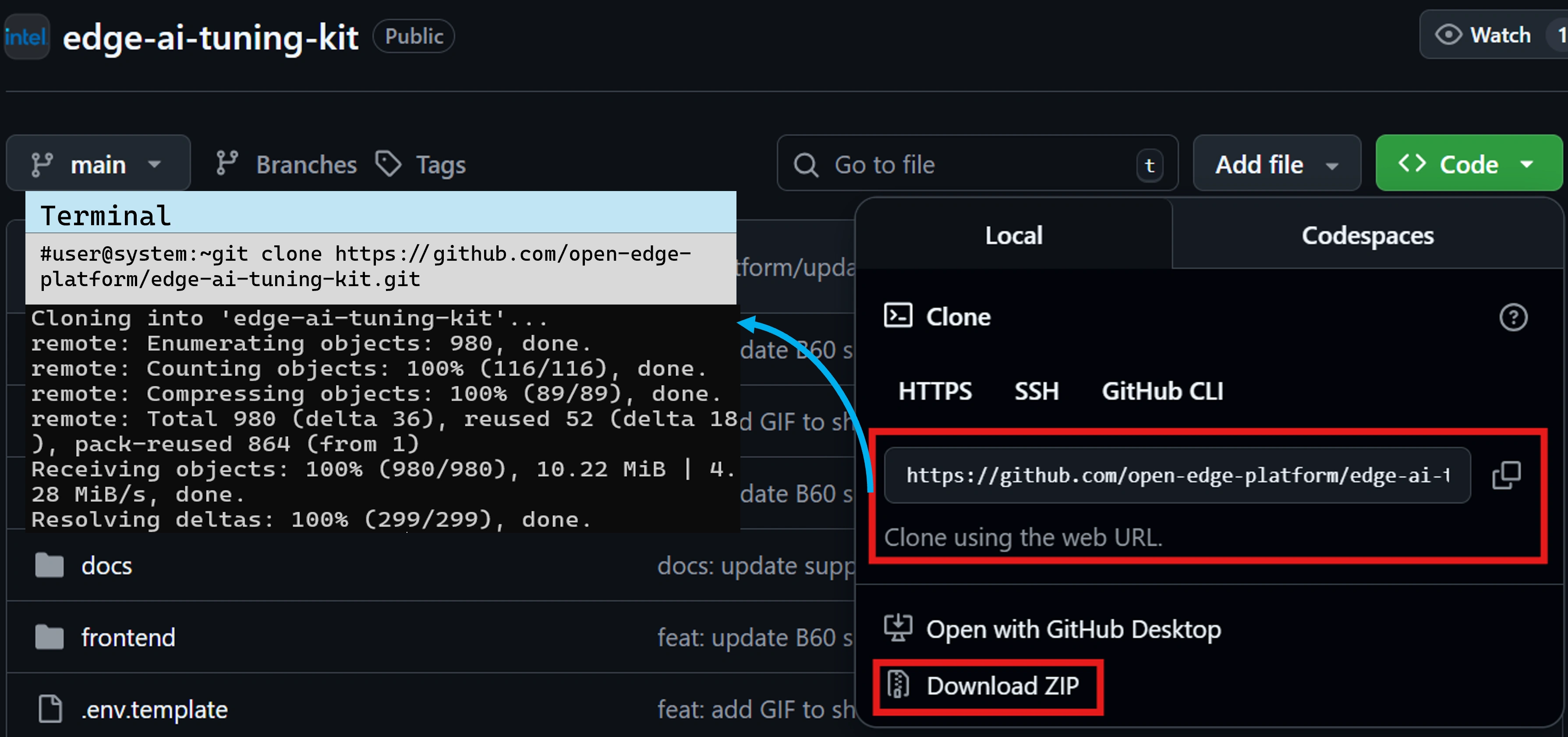 - To pull Edge AI Tuning Kit source files, simply use git clone command on a command line console as shown here.